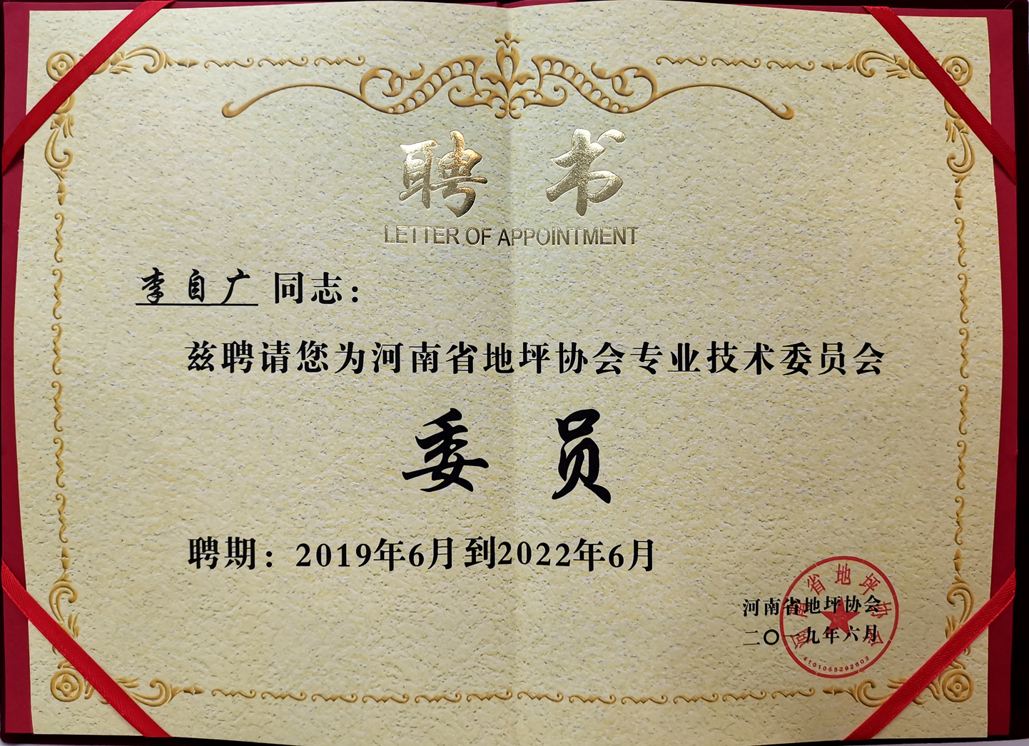 河南省地坪協(xié)會(huì)**技術(shù)委員會(huì):“委員” 證書(shū)